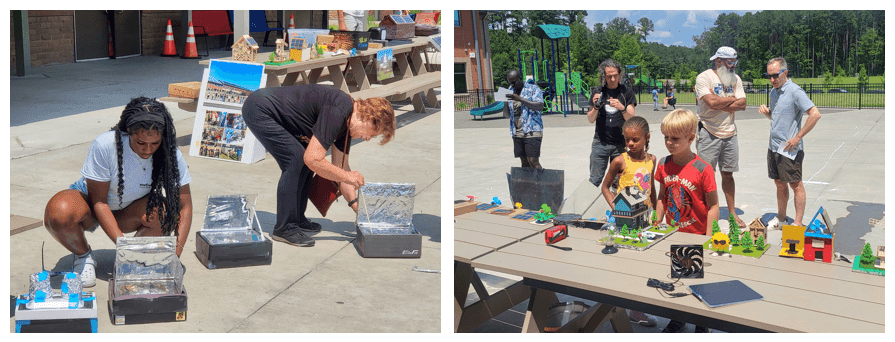 Photo caption: The Solar Festival featured interactive activities like a solar oven bake-off and solar-powered community design competition. (Left) Dr. Wafa Khalil sets up for the solar bake-off with a student leader from Men and Women United for Youth and Families. (Right) Two Lyons Elementary students check out the houses from the solar-powered communities display.